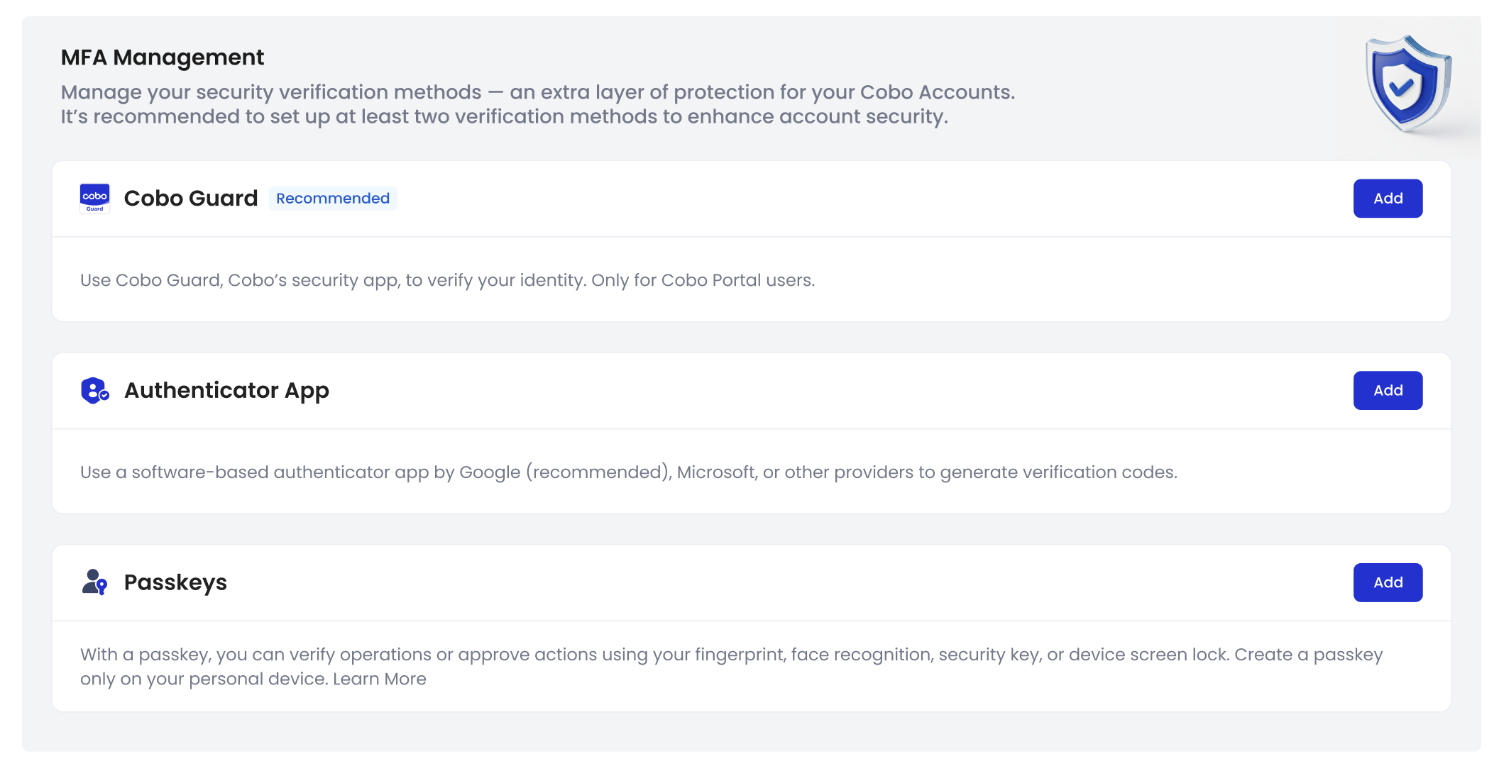 - 登录 Cobo Accounts,可以看到 MFA Management 部分。