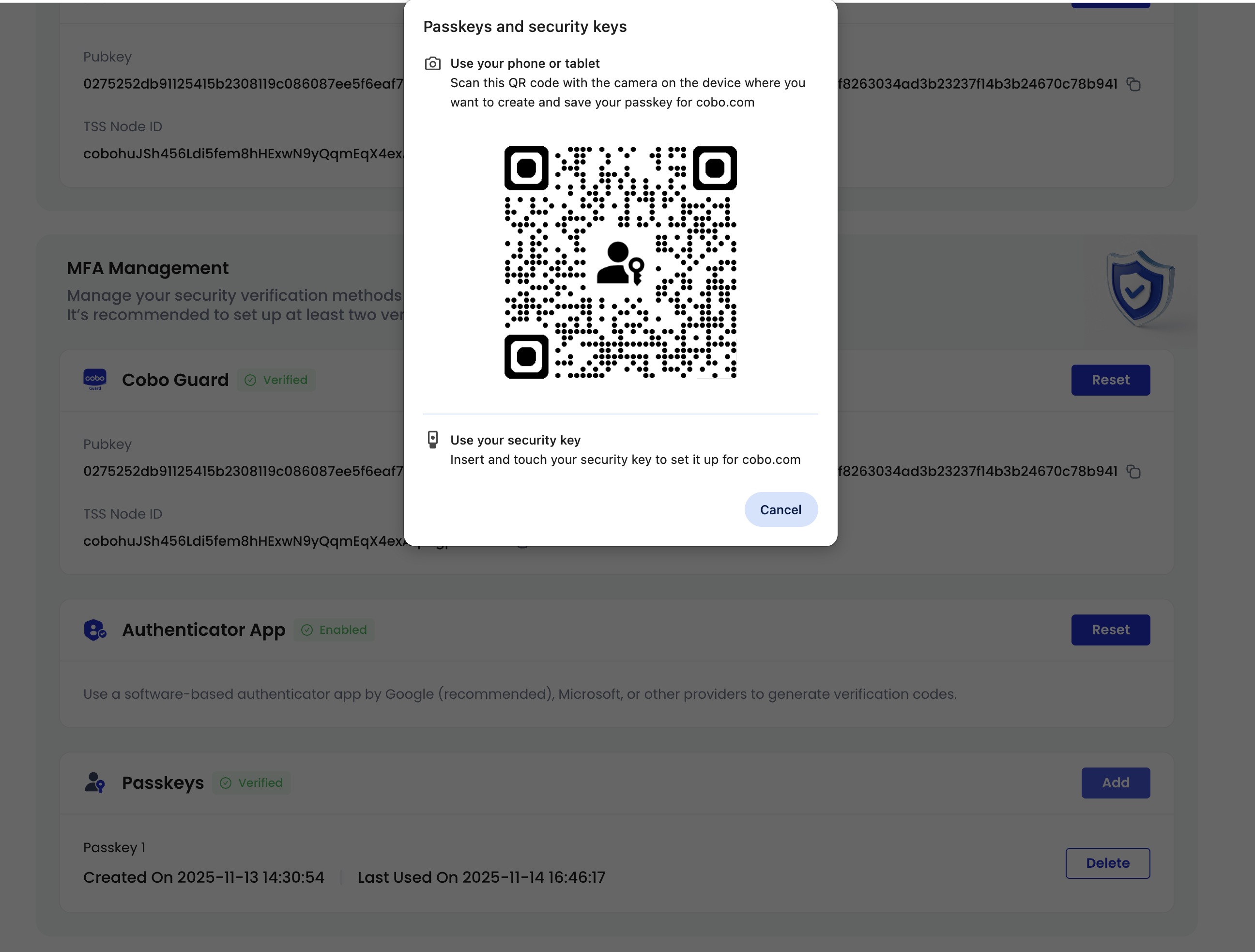 通行密钥是一种更简单、更安全的身份验证方案。创建通行密钥后,您可以通过指纹、面部识别或屏幕锁(PIN 码)或硬件进行 Cobo Portal 中各种活动的验证。您最多可以向您的 Cobo Accounts 添加 10 个安全密钥。