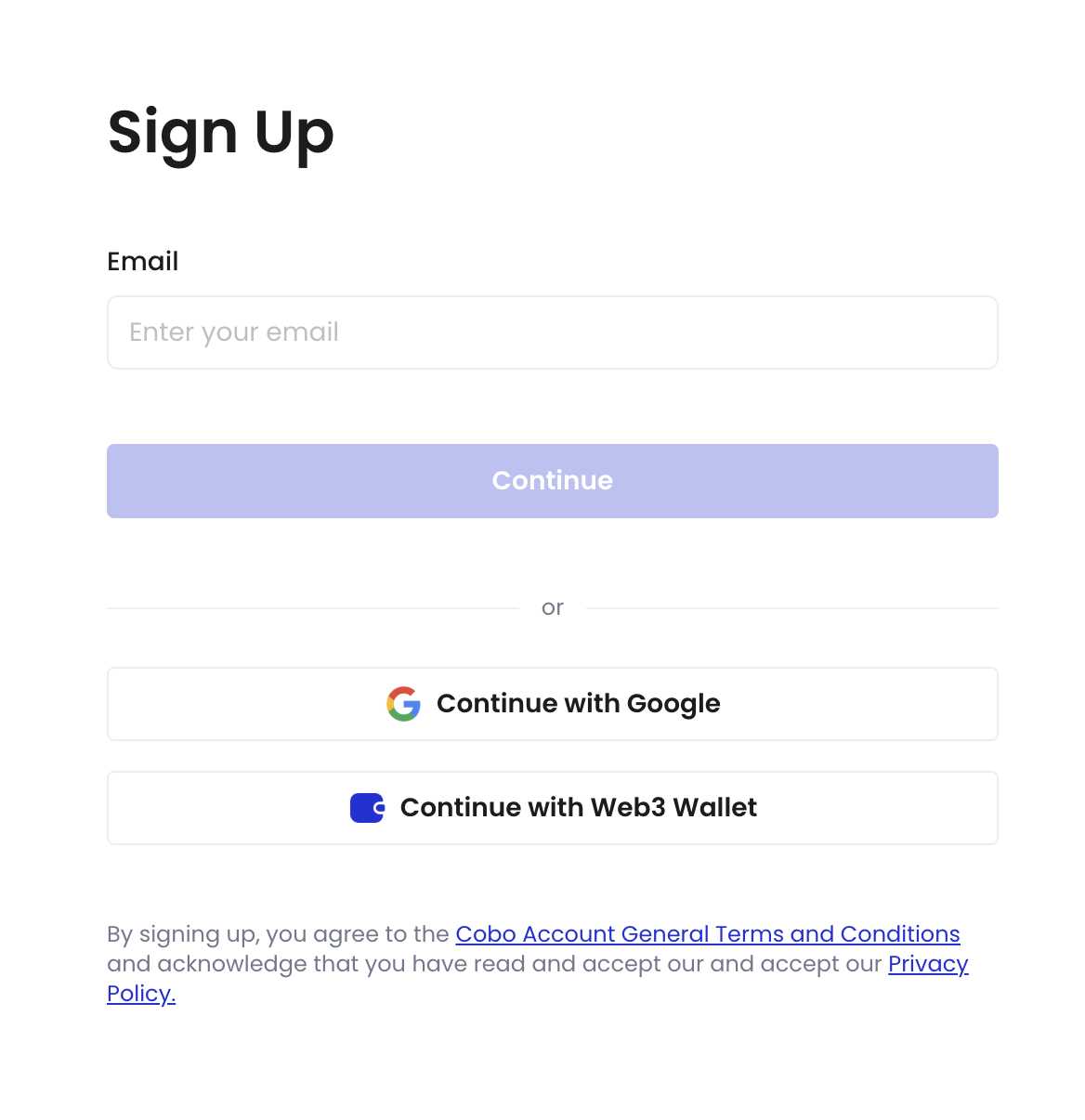 - Go to Cobo Accounts and click the Sign Up in the top-right corner to Sign up page.