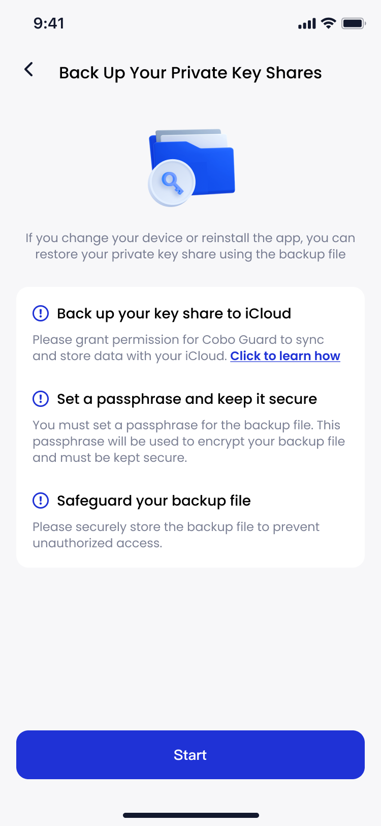 On the Back Up Your Private Key Shares screen, tap Start, then authenticate yourself using Face ID.