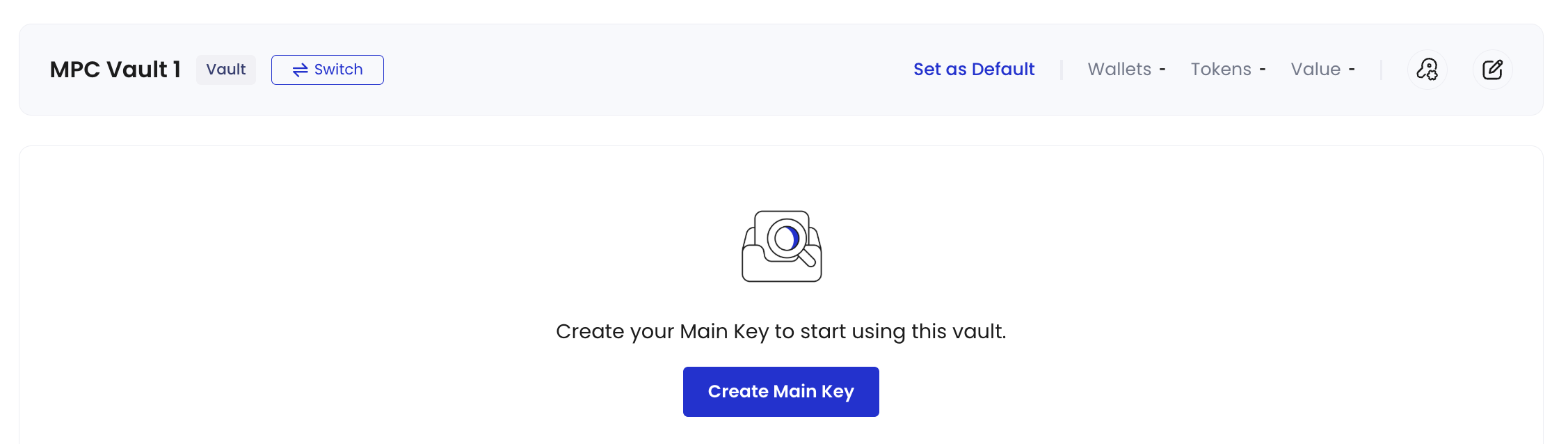 On the Cobo Portal, the Admin navigates to MPC Wallets, selects the target vault, and clicks Create Main Key.
